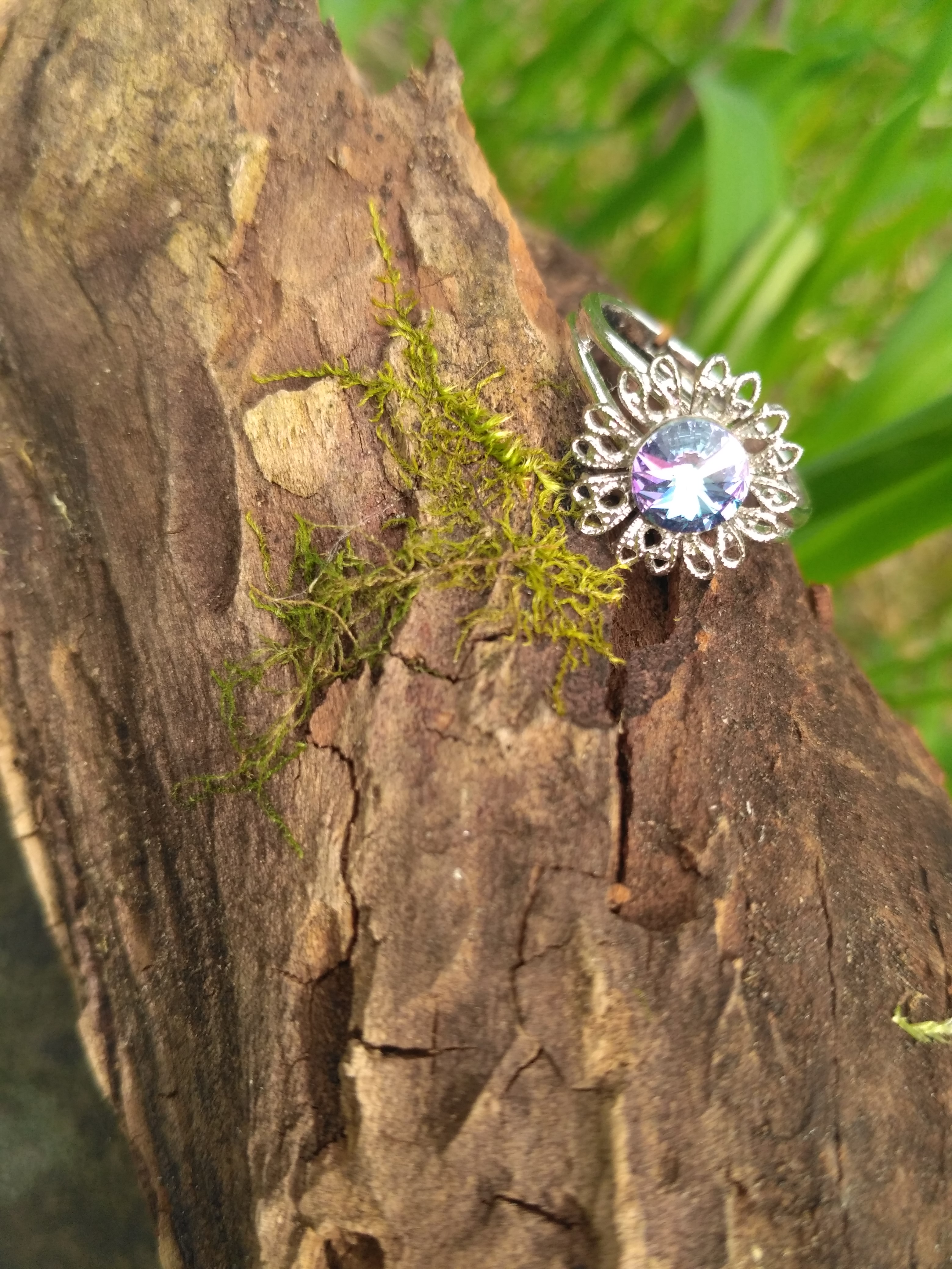Drobný prstýnek s povrchovou úpravou rhodium je zdobený krásným modrofialovým rivoli. Nastavitelná velikost.