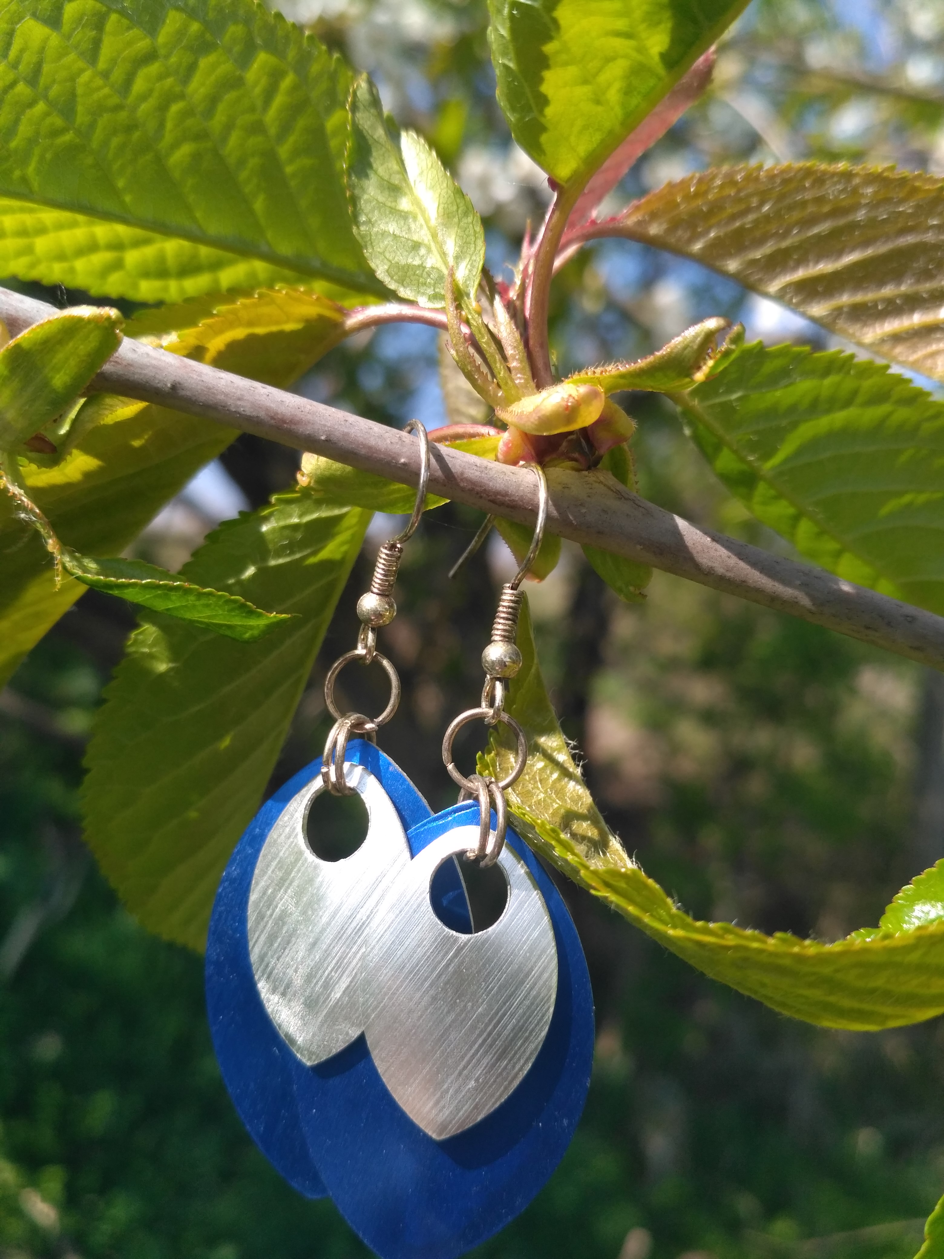 Náušnice jsou vyrobené z eloxovaných hliníkových šupin a díky tomu jsou velmi lehounké, jsou opatřeny postříbřenými afroháčky. Délka náušnic bez háčku cca 4,5cm. celý popis