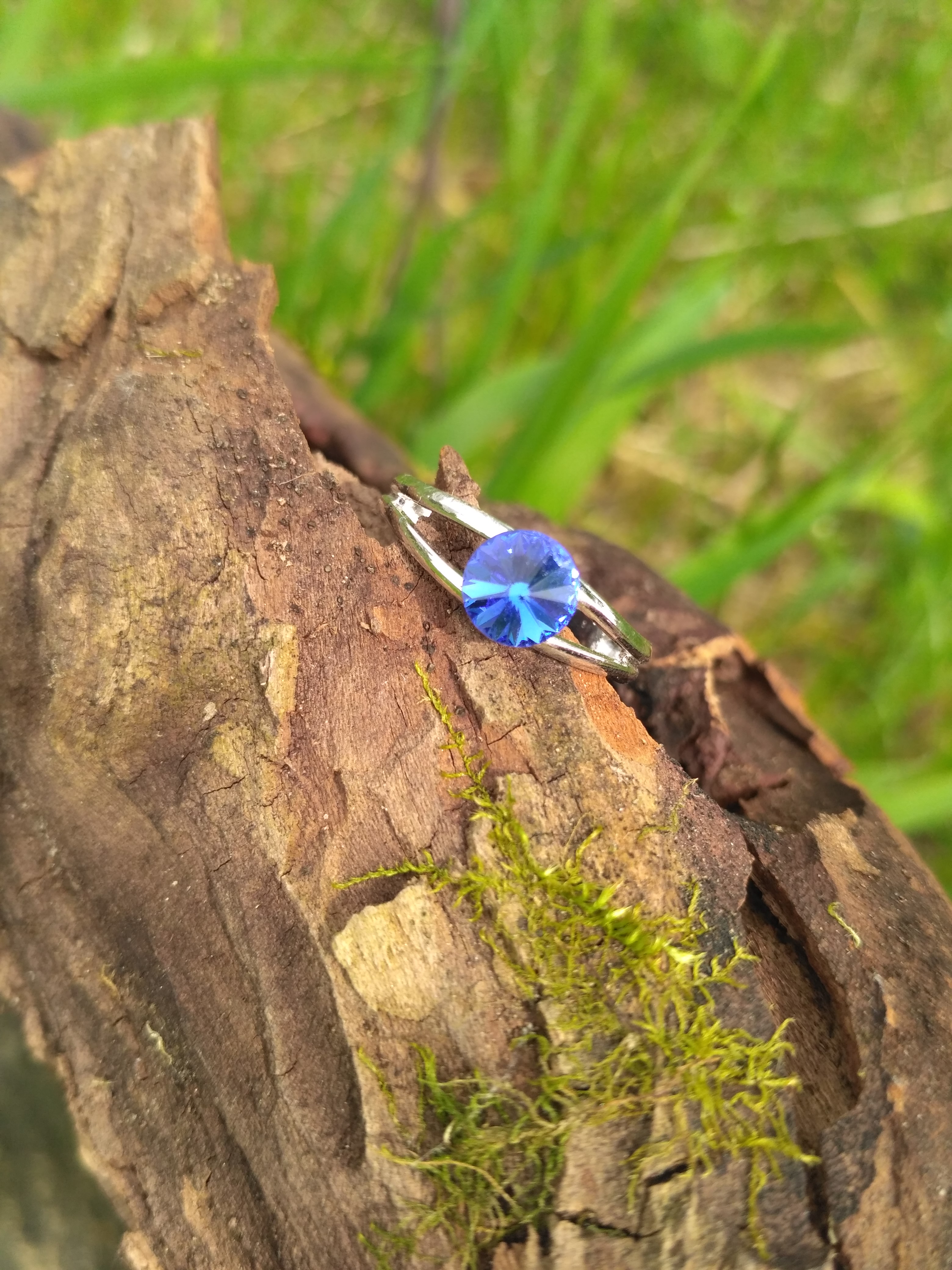Krásný nastavitelný prstýnek s modrým cca 6mm velkým kamínkem. Povrchová úprava rhodium.